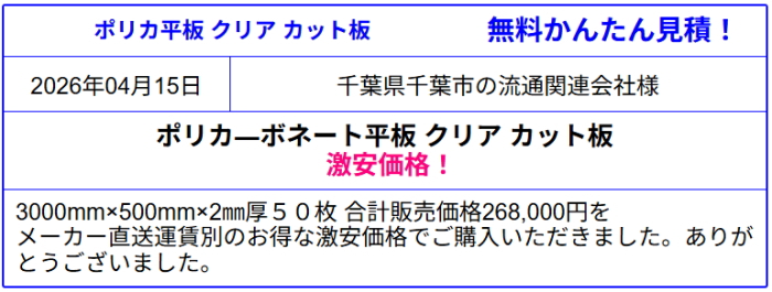安心の国産品 ポリカ-ボネート板 激安価格 全国販売◆価格表より更にお安く!ポリカ平板の価格を確認!送料一律2,000円(30キロ未満3,000円)面倒な入力・会員登録なし