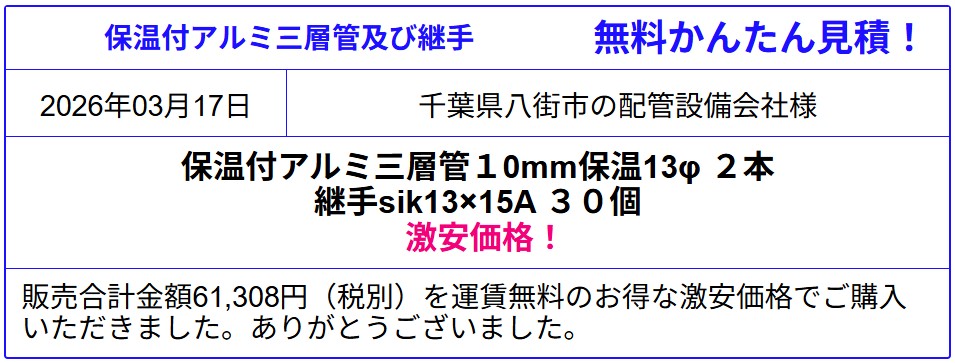 現金問屋 (株)オートミ アルミ三層管・継手 最安値! Sik 13x15A ¥1,247! エコキュート用配管 見積無料!販売専門会社 !