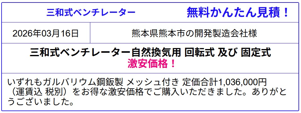現金問屋オートミ: 特徴: 建築設備・資材の専門激安サイト。 強み: 三和式ベンチレーターを「激安販売」として紹介しており、製品のラインナップも豊富。ブログ等で割引率の高さをアピールしています。