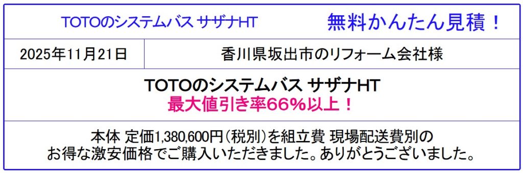 TOTO サザナ 販売専門◆TOTO サザナが値引き率66%以上!TOTOのシステムバス サザナの激安価格をシミュレーション!見積は面倒な入力一切なし!見積後の取止めOK!