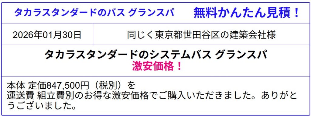 タカラスタンダード システムバス グランスパ 販売専門◆タカラのグランスパが激安価格!値引き率を確認!見積は会員登録なし!見積後のキャンセルOK!カタログ掲載!