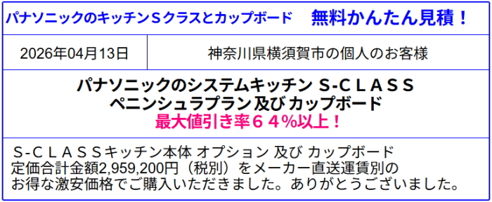 パナソニック キッチン Sクラス 格安価格 販売専門◆パナソニックのシステムキッチン Sクラスの値引率を確認!見積は面倒な入力なし 見積後の取止めOK!