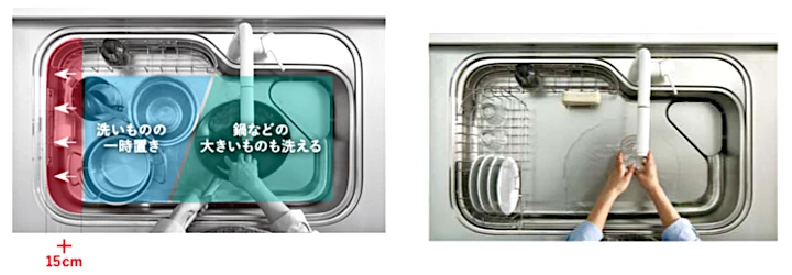 メリット ワークトップが非常に広く、収納力も抜群です。複数の作業を同時に進めやすく、複数人での調理にも適しています。