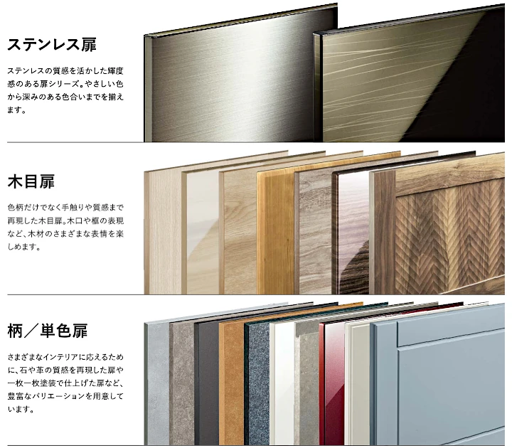 扉材、ワークトップ、シンクなどのサンプルが豊富に用意されており、実際に組み合わせて色の相性や質感を確認しながら、理想のコーディネートを検討できます。