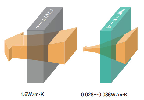 ミラフォームの熱伝導率はコンクリートの約1/50。省エネ効果に優れた断熱材です。